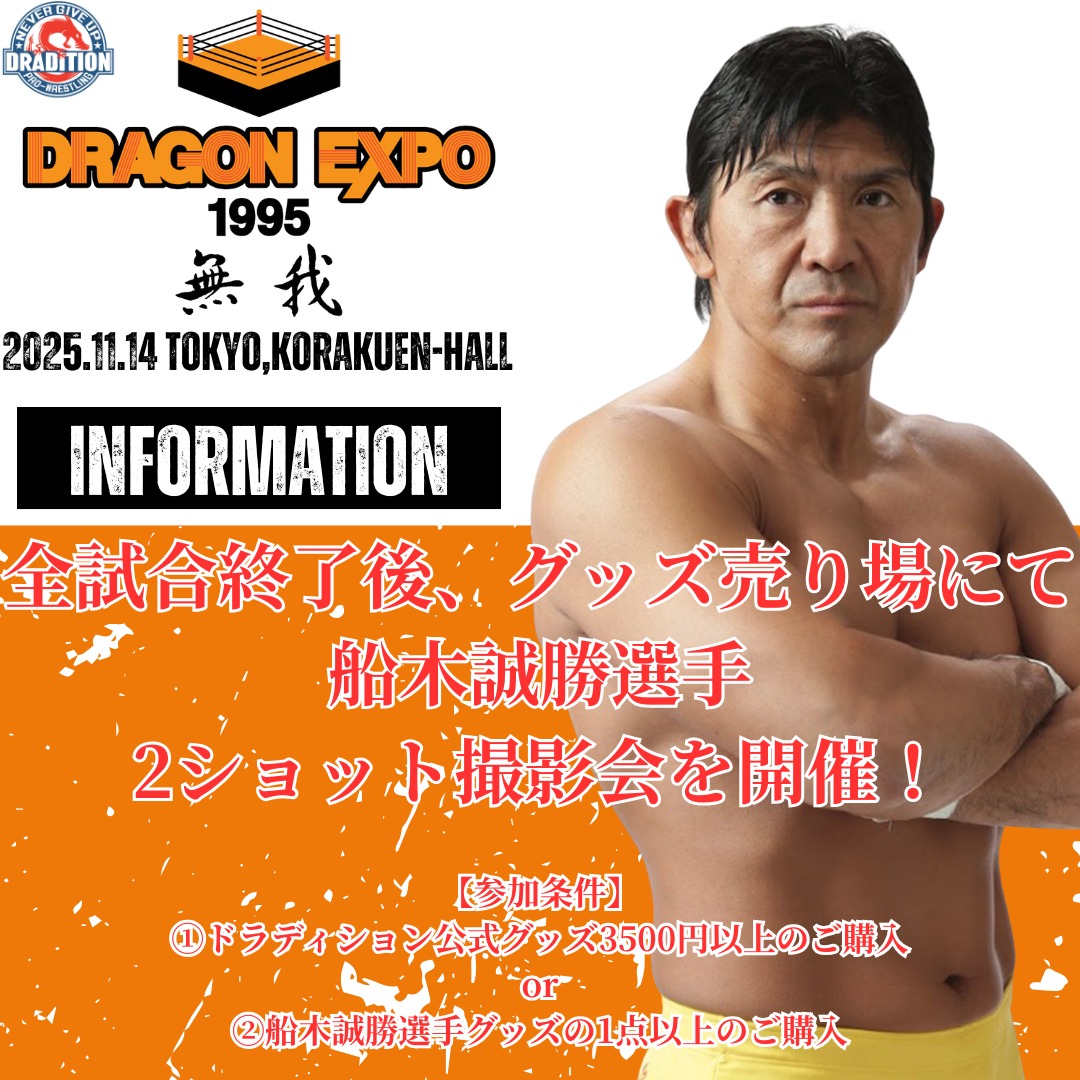 11月14日に後楽園ホールにて開催される「DRAGON EXPO 1995〜無我〜」の全試合終了後、会場内グッズ売り場にて「船木誠勝選手2ショット撮影会」の開催が決定!