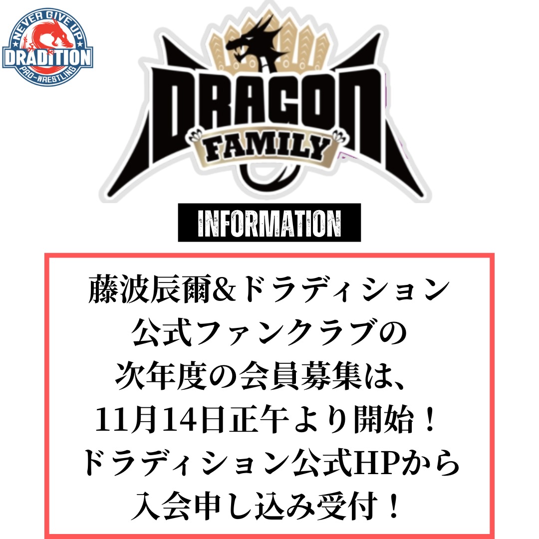 藤波辰爾&ドラディションの公式ファンクラブ「DRAGON FAMILY」の次年度の会員募集が11月14日正午よりドラディション公式HP内「ファンクラブページ」にてスタート!