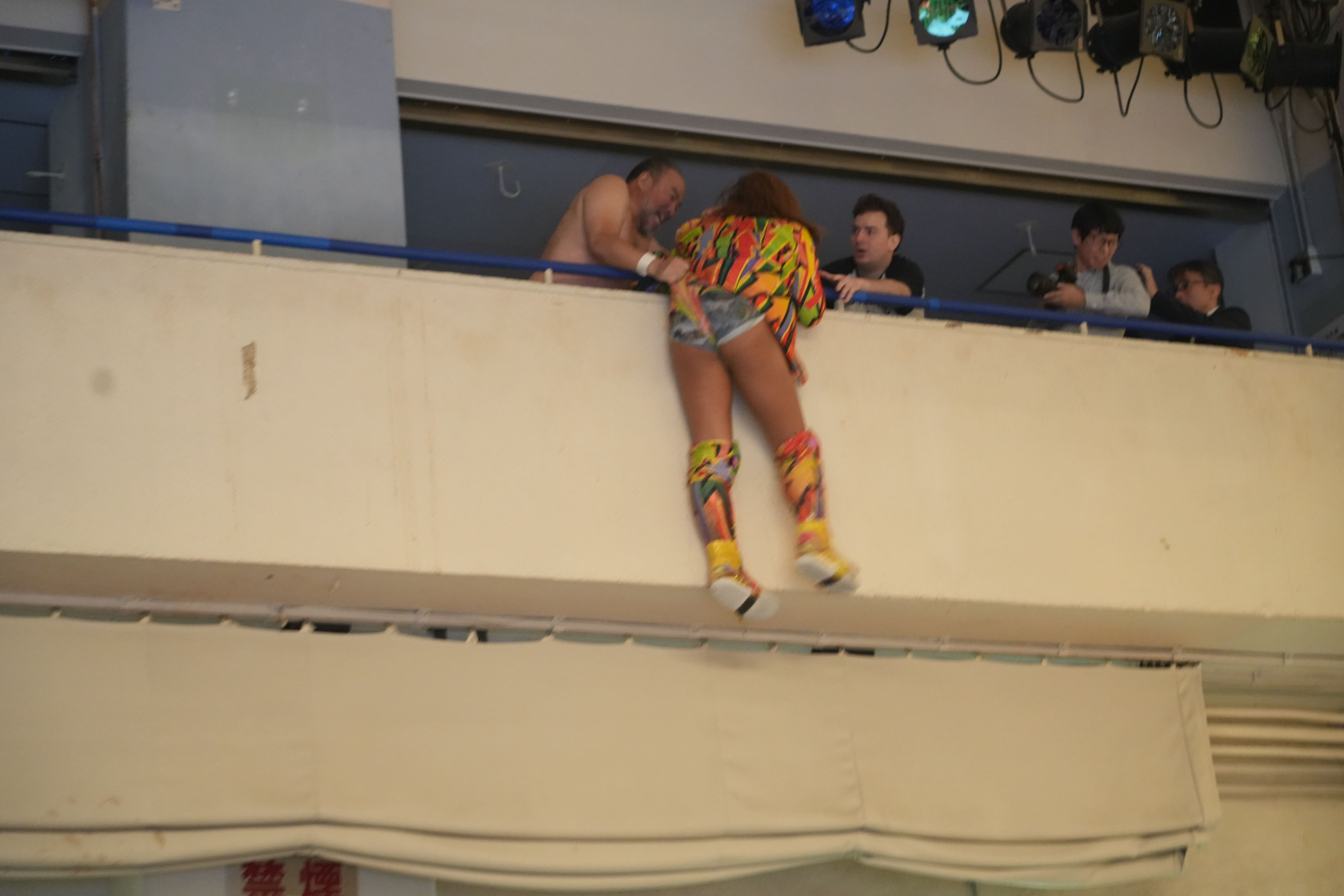 観客席を逃げ回る黒潮を越中が追いかける「トムとジェリー」的な展開を経て、 ついに戦場は後楽園ホール2階のバルコニーまで移動。越中は「落ちろって!」と黒潮を落下させようとする。 腕一本でバルコニー手すりにしがみつく黒潮に会場中が息を飲む中、災難続きのレフェリーが両者反則の無効試合を告げて終了ゴングを要請。 無我時代では考えられない結末だったものの、黒潮はそのまま姿を消し、リングへと戻った越中は「まだまだやれるって!」と試合続行を訴えていた。
