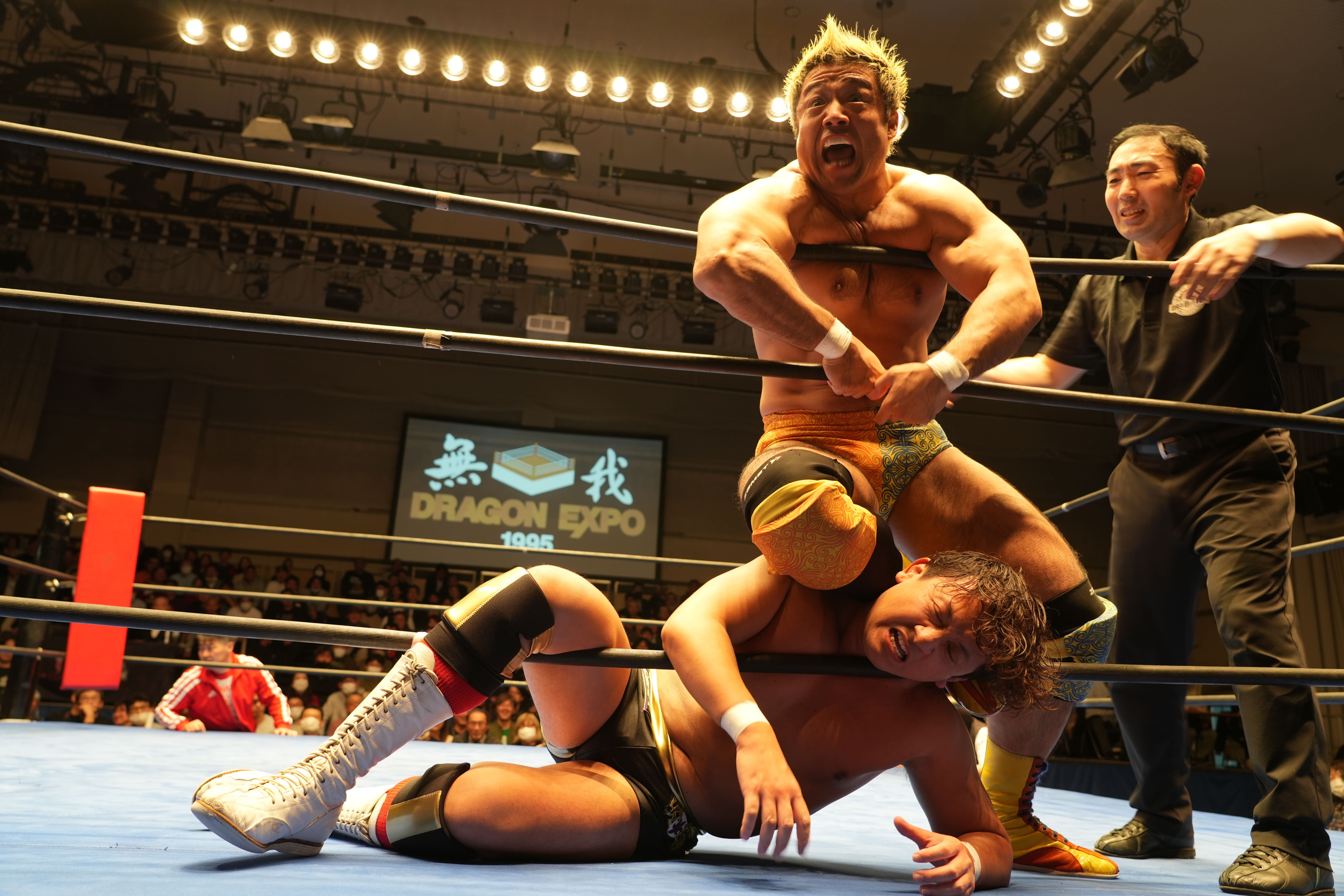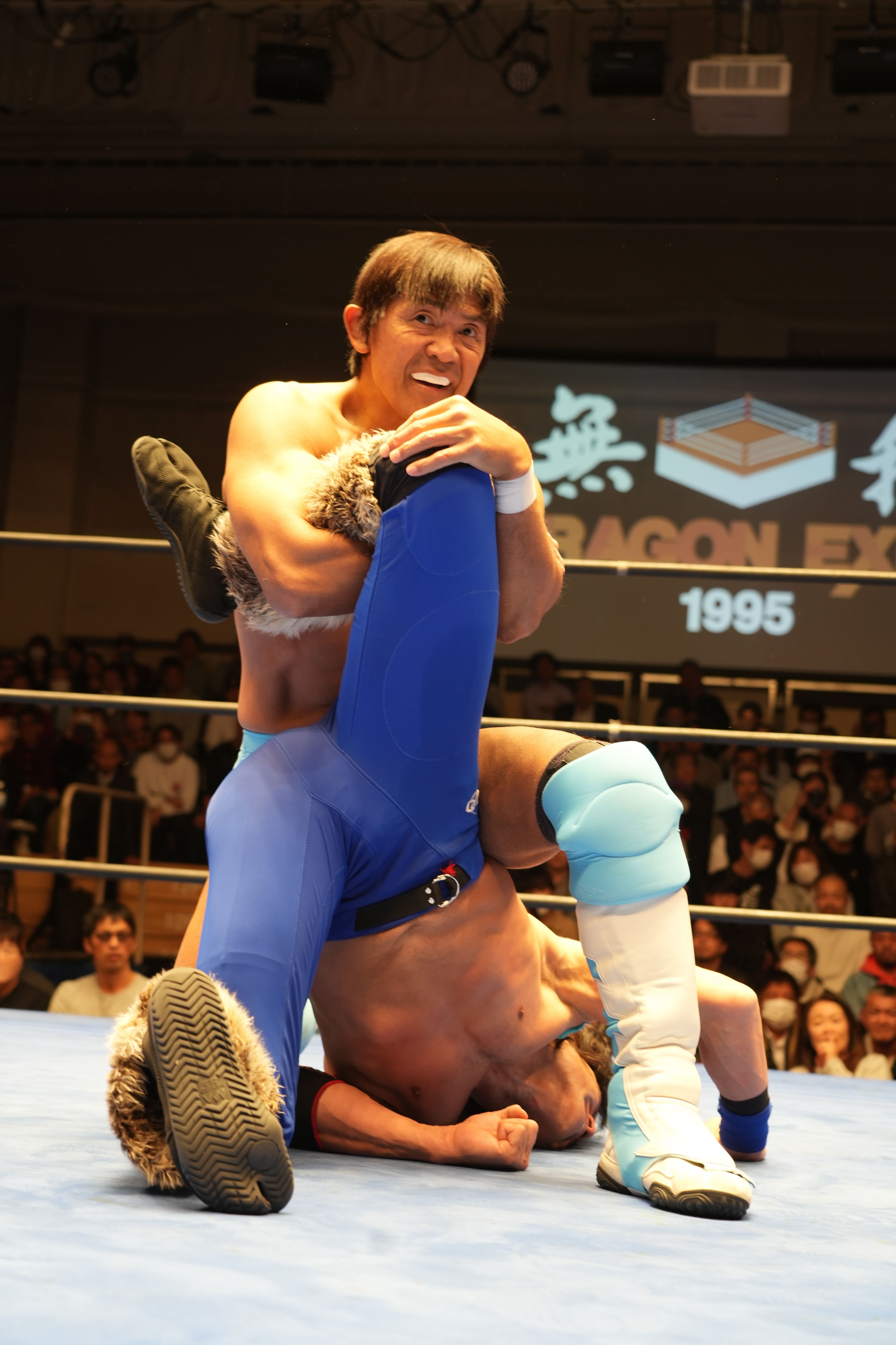 新日本プロレスのヤングライオン時代に切磋琢磨していた両者は、基本に忠実な寝技、関節技、絞め技を駆使しつつ一進一退の攻防。あっという間に5分が経過する。