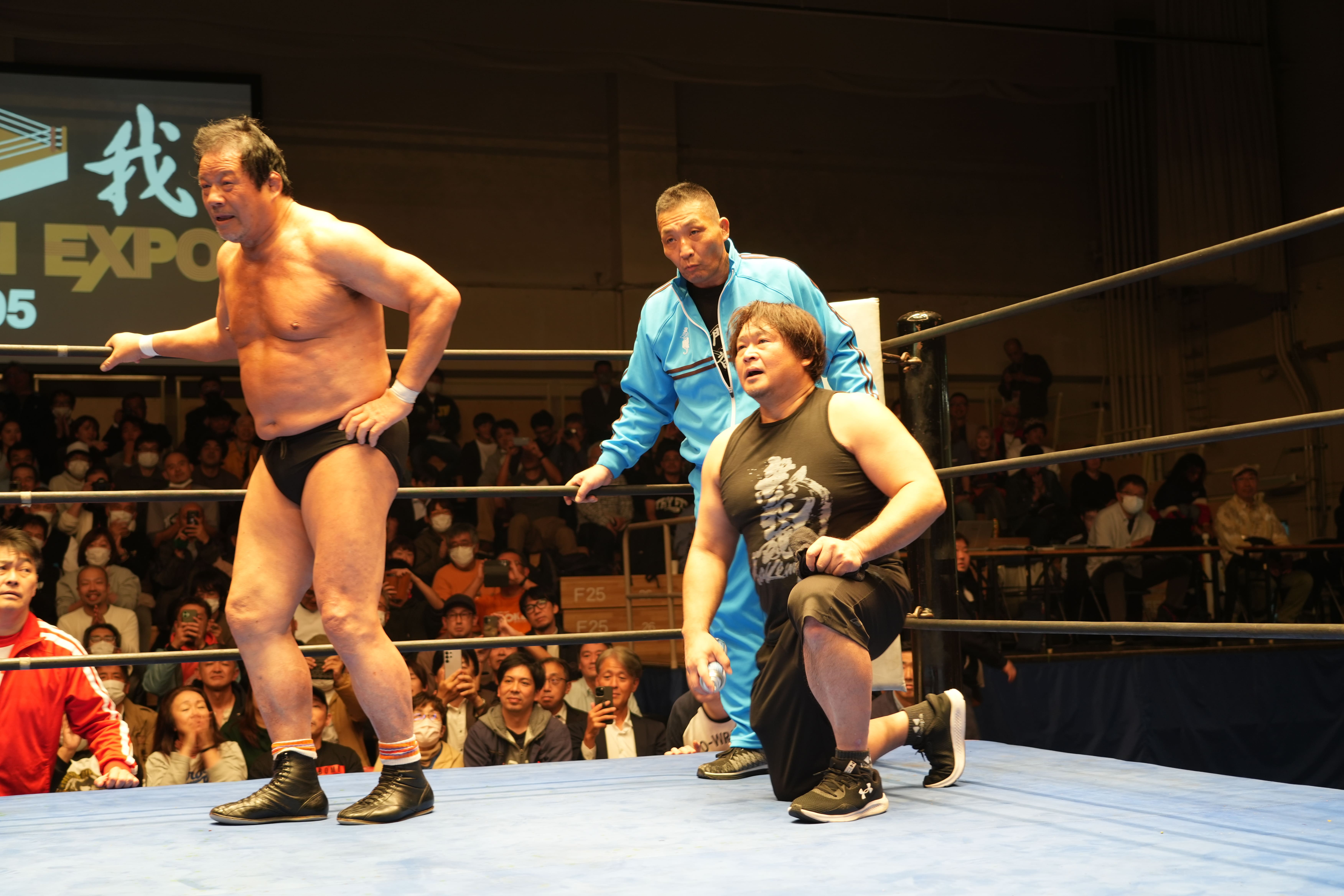 21世紀初頭、長井が魔界倶楽部に所属していた時代に、新日本プロレスのリングで激闘を繰り広げていた両者(ともに1968年生まれ)が57歳となって一騎打ち。 それだけに序盤から、お互いにベーシックな腕の取り合い一つとっても意地の張り合いが目立つという展開に。