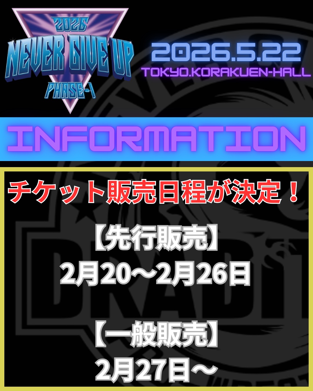 5月22日後楽園ホールにて開催される「NEVER GIVE UP 2026 PHASE-1」のチケット販売日程が決定!