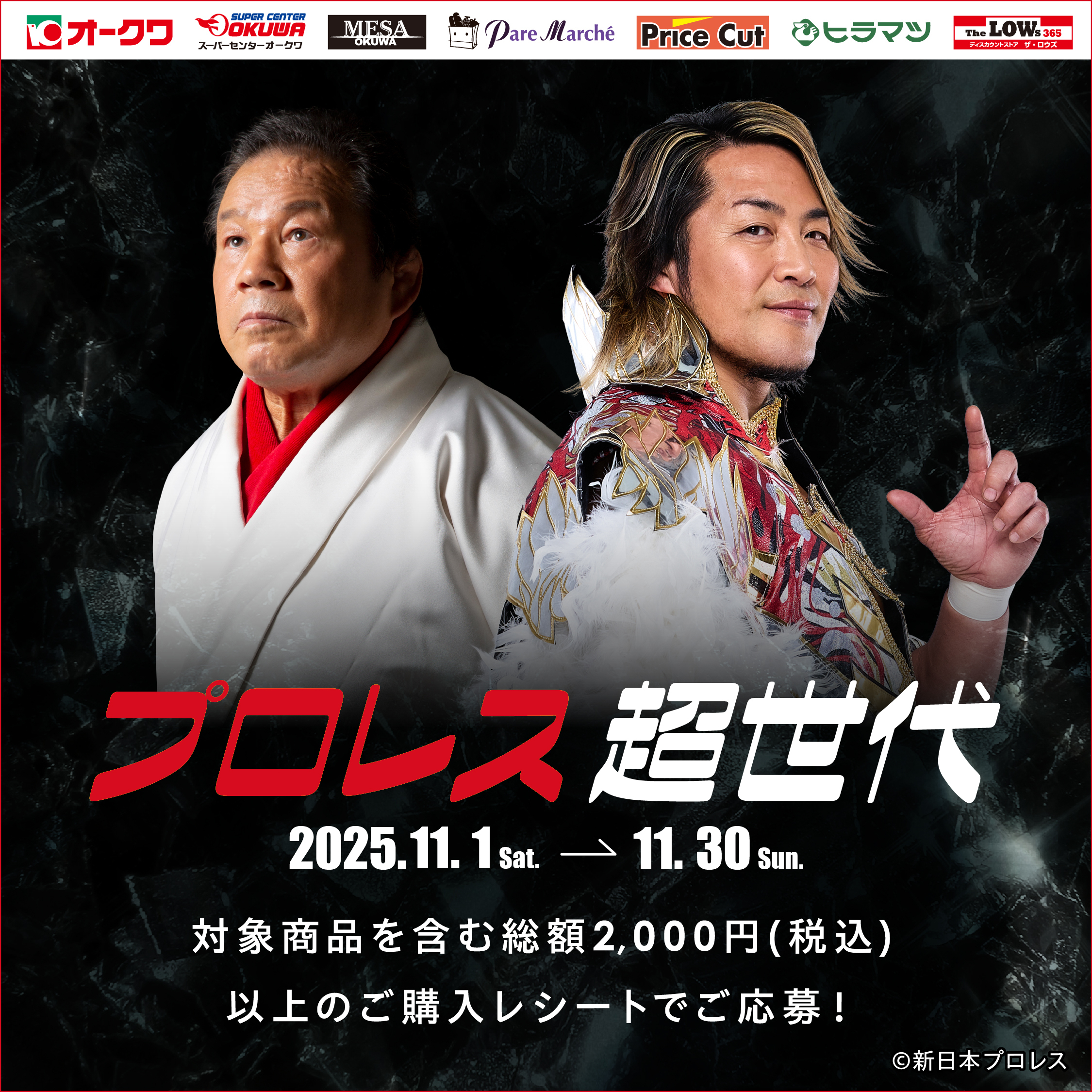 【キャンペーン情報】藤波辰爾選手:近畿・東海に展開するオークワグループでも藤波選手、棚橋選手が参加する『プロレス超世代キャンペーン』がスタート! (2025/11/05)