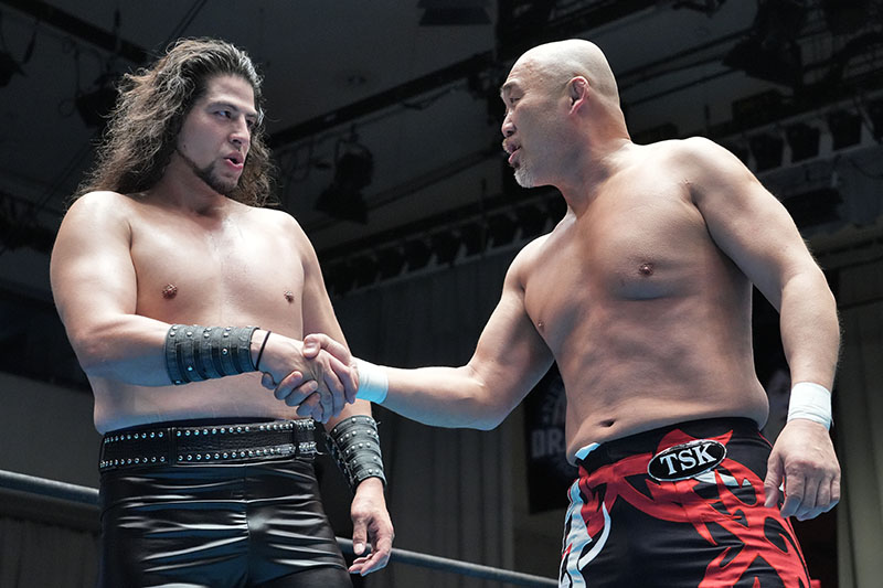2人は合掌からの握手を交わし、試合後のバックステージでも、黒潮が「楽しかった」と満面の笑みを浮かべれば、新崎も「すごく面白かった」とゴキゲン。黒潮は「僕はみちのくプロレスを見て育ったので、人生さんが入場する背中を見た時に、おーっ!新崎人生だ!となって」と感激したことを告白。「プロレス人生で落ち込んだら、新崎さんの弟子になりたいなと思います」と申し出て、新崎も快諾していた。