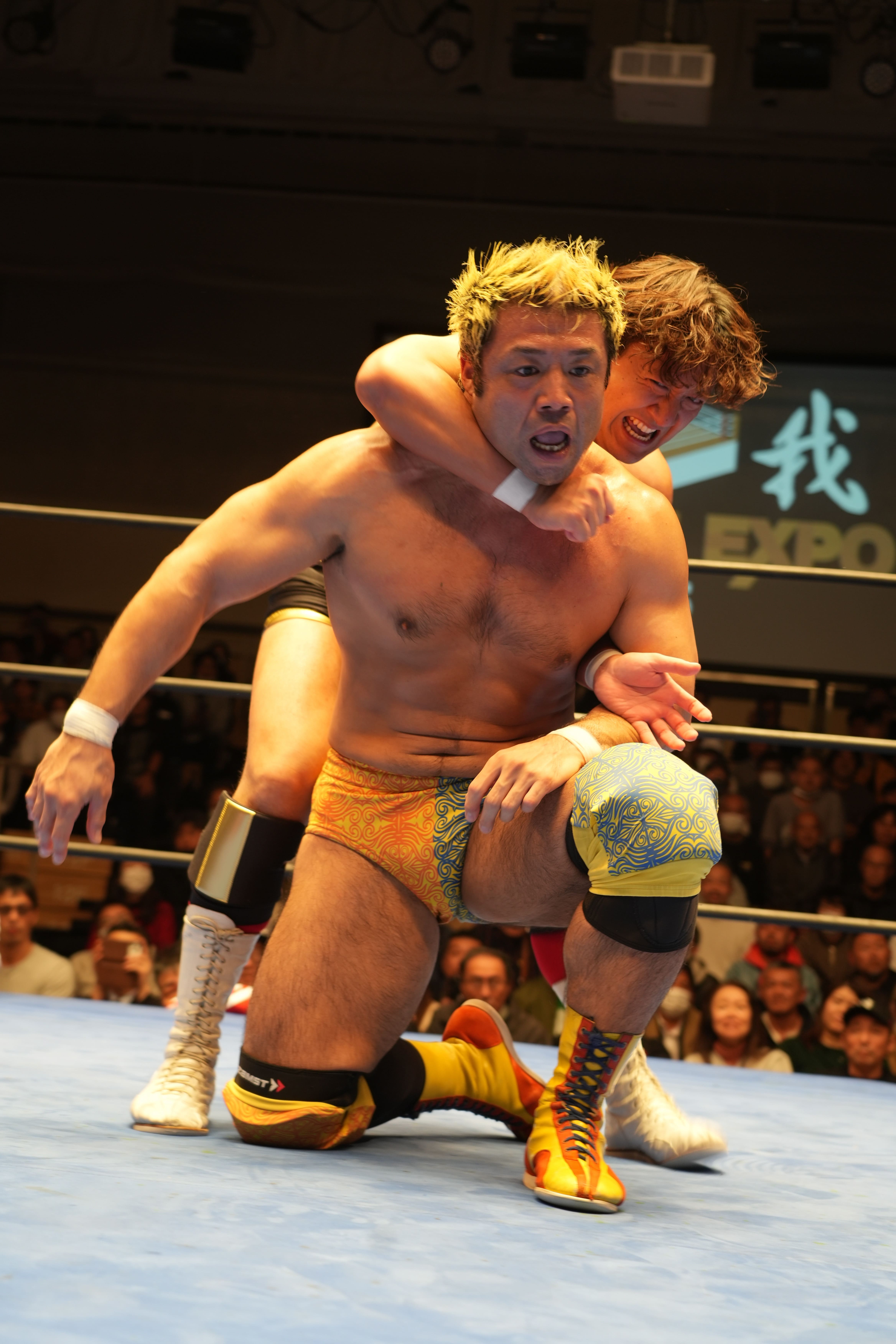 新日本プロレスのヤングライオン時代に切磋琢磨していた両者は、基本に忠実な寝技、関節技、絞め技を駆使しつつ一進一退の攻防。あっという間に5分が経過する。